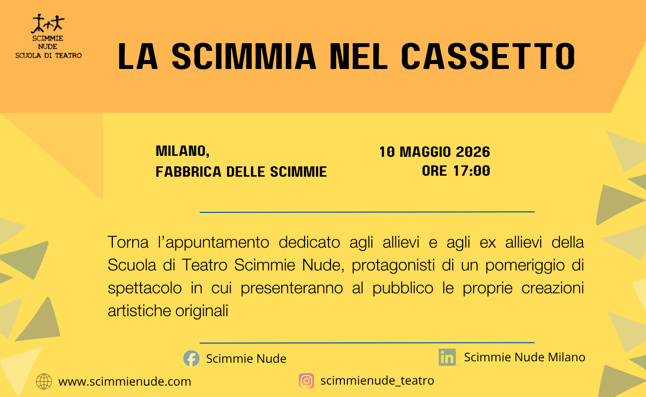 La Scimmia nel Cassetto è un evento dedicato agli allievi ed ex allievi della Scuola di Teatro Scimmie Nude, che per un pomeriggio portano in scena le proprie creazioni artistiche. Alla Fabbrica delle Scimmie, in Fabbrica del Vapore a Milano, il pubblico incontrerà performance originali, nate in autonomia e attraversate da linguaggi espressivi diversi.